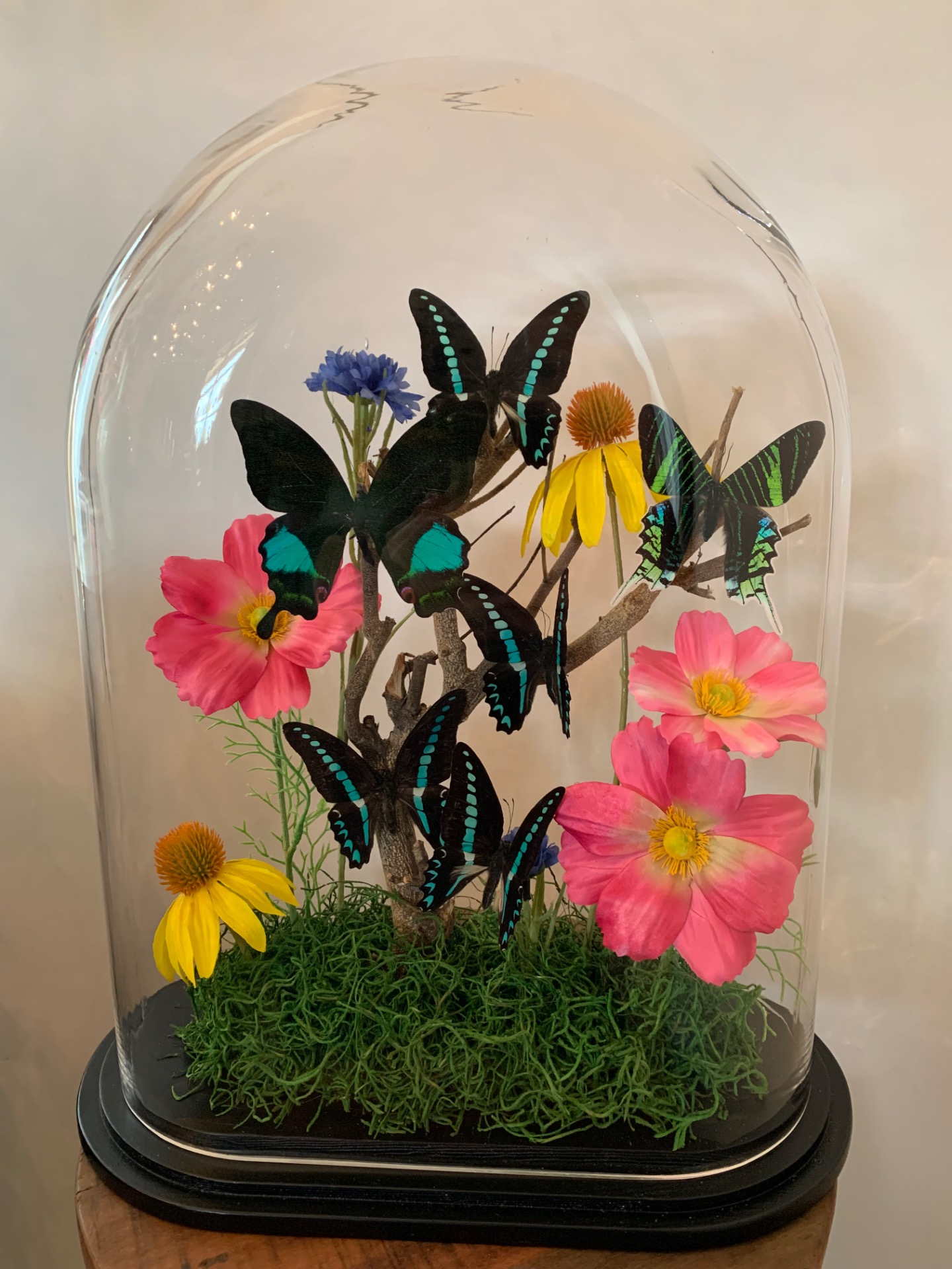 Maat stolp: 30x16x40cmIn deze stolp zijn de vlinders gecombineerd met mooie zijden bloemen. Hierdoor is het een mooi kleurrijk geheel. Een echte eye-catcher!